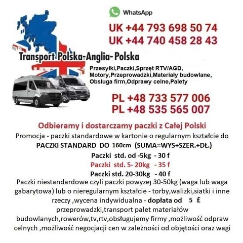 Oferuję transport PL-UK-PL przewóz paczek , palet , przeprowadzki. Jako doświadczona firma oferujemy naszym klientom kompleksową obsługę przesyłek na trasie Polska-Anglia.