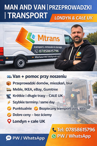 Planujesz przeprowadzke i masz rzeczy do przewiezienia? takie jak; pudelka,zapakowane kartony,walizki,worki z ciuchami ,sprzet elektroniczny,meble,materace,itd..Chcesz przewiezc narzedzia potrzebne do pracy?potrzebujesz odebrac meble ze sklepu ikea,b&q.chcesz przewiezc materialy budowlane potrzebne do naprawy domu lub odebrac przedmioty zakupione na aukcjach internetowych? Chetnie pomoge oferujac transport nie tylko w londynie i okolicy,ale takze na terenie calej wielkiej brytanii oraz europy!!!!! -pomoc przy zaladunku i rozladunku!!!! -posiadam koce do zabezpieczenia sprzetu!!!! -bardzo mily kierowca!!!!!! -dyspozycyjnosc 7 dni w tygodniu 24/7!!!!! - z gory ustalana cena!!!!!zadnych ukrytych kosztow!!!!! -wystawiam faktury!!!!! zapraszam!!!!!! tel.07858615796 email.mariusz198736@gmail.com mariusz(mtrans)
